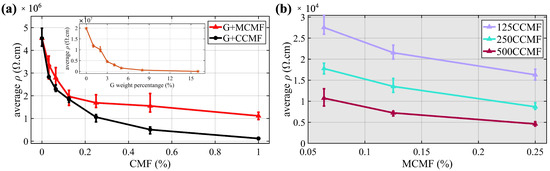 The percolation curves for MCMF and CCMF are compared in Figure 6a, and exhibit a significant decrease in resistivity at low concentrations, with the most notable reduction in resistivity occurring within the range of 0.032 wt% to 0.25 wt% for MCMF and 0.0125 wt% to 0.5 wt% for CCMF, causing decreases in resistivity of 71% and 205%, respectively. The percolation behavior of MCMF (red line) differs from that of CCMF (black line) by exhibiting a more gradual decrease in resistivity, attributable to the distinct aspect ratios of the fibers.
