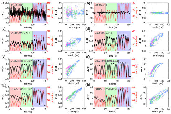 Time histories of electrical and strain measurements under increased loading frequency for specimens (a) 0G0CMF; (b) 3G0CMF; (c) 3G1000MCMF; (d) 3D500CCMF; (e) 3G125M500CCMF; (f) 3G250M250CCMF; (g) 3G250M500CCMF; (h) 3DP-3G250M250CCMF.