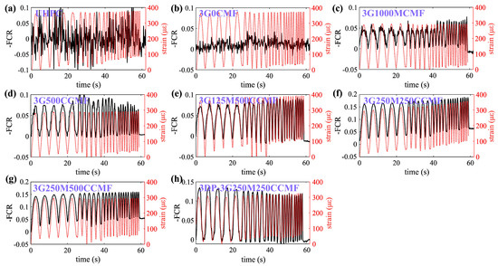 Figure 8a–g presents time series plots for UHPC specimens doped with key mix designs compared against strain input to evaluate the stability of the piezoresistive response under dynamic cyclic loading. Similar to the results obtained from the quasi-static cyclic loading test (Figure 7), the UHPC-only specimen (0G0CMF) also exhibited no discernible piezoresistive response, displaying high levels of noise and no clear correlation between the electrical signal and applied strain. The addition of G in the UHPC specimen (3G0CMF) improved the conductivity of the matrix and reduced noise levels but did not allow the measurement of the dynamic load.