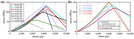 Figure 9a compares the 28-day three-specimen averaged stress–strain curves for G-filled specimens with different G inclusion levels. It can be found that the addition of G to the UHPC led to a decrease in compressive strength, defined as the maximum stress attained before failure, here ranging from 2.6% to 68.0% as the G content increased from 1 wt% to 16 wt% compared to the UHPC-only specimen (0G0CMF). Similarly, Young’s modulus (E), calculated from the slope of the elastic region indicating the material’s stiffness, exhibited a reduction of 1.7% to 33.8%, while the ultimate strain decreased by 4.6% to 50.1% across the same G content range. These results suggest that the material becomes both less stiff and less ductile with increasing G content. The decrease in these mechanical properties can be attributed to several factors: the lower modulus of elasticity of G, its capacity to absorb water through its pores, interference with UHPC hydration as G particles occupy spaces that would otherwise facilitate the formation of calcium silicate hydrate (C-S-H); weaker bonding at the interface between G particles and the cementitious matrix, and less dense particle packing as the addition of G tends to introduce voids and increase porosity [28].