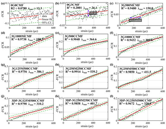 Figure 10a–l plots the -FCR versus strain taken from the 0 to 600 region of the monotonic compressive loading test. This strain range was selected because it is representative of the operational strain in SHM applications, and also because it remains within the elastic region of the material’s behavior, where the piezoresistive response is the most linear and stable, ensuring the repeatability of tests. Plots include a linear fit (red solid line) and its associated 95% confidence interval (CI) bound (dashed green lines). The linearity of the measurements (R2) and strain gauge factor () computed from the slope of the linear fit are identified in each subplot. The presented datasets are taken from the best-performing specimen under each mix design in terms of the linearity of the signal. Table 5 assembles the quantitative three-specimen averaged sensing metrics obtained from Figure 10 under each mix design, where the resolution is defined by the FCR range within the 95% CI and the equivalent strain levels computed using Equation (4), as indicated in Figure 10b,c, respectively, and the accuracy () is computed as the standard derivation of the resolution.