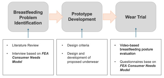 This study adopts a mixed methods approach throughout the design process, which comprises three key phases: identification of breastfeeding and postpartum issues and needs; designing and development of the smart nursing underwear; and evaluation of the effectiveness of the proposed underwear (Figure 1). First, in-depth interviews with 12 Chinese mothers who were breastfeeding or had breastfed recently at the time of the interviews were conducted by using the Functional, Expressive, and Aesthetic (FEA) Consumer Needs Framework to understand user requirements. Based on their insights, the design specifications were established, which guided the design and production of the proposed nursing underwear. In the evaluation phase, a wear trial was implemented, which incorporated a video-based posture analysis for an objective evaluation alongside a survey developed according to the FEA Consumer Needs Framework to collect subjective feedback from the participants. The FEA Consumer Needs Model considers the three criteria of functionality, expressiveness, and aesthetics and is particularly relevant for functional-oriented product development. A review [19] shows that a number of designers have effectively applied this model to develop functional designs and smart garments, thus validating its utility.