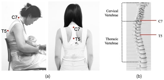 According to the United Nations Children’s Fund (UNICEF), over 130 million newborns are born globally each year [1]. The World Health Organization recommends that babies should be exclusively breastfed for at least six months and then, along with complementary food for up to two years or beyond [2]. However, breastfeeding often requires long periods of maintaining a static posture, as the feeding sessions can last up to 30 min and occur up to 10 times daily [3]. Consequently, poor posture during breastfeeding can lead to a range of musculoskeletal disorders, including mechanical neck pain, lower back pain, scapular dyskinesia, carpal tunnel syndrome, and even sciatica [4,5,6]. Moreover, these physical issues can also impact maternal mental health, which may indirectly affect infant development [7,8]. Although improper posture during breastfeeding can cause significant pain, many nursing mothers have little knowledge and awareness of the correct posture for breastfeeding. Farooq et al. [4] conducted a cross-sectional study in Pakistan and reported that 43.3% of the women in their study had poor knowledge about the correct positions for breastfeeding. People with less sensitive internal systems would maintain an incorrect posture for extended periods of time until their symptoms become severe enough to require medical attention [9]. Therefore, smart systems that address improper posture during breastfeeding and provide external feedback are essential.