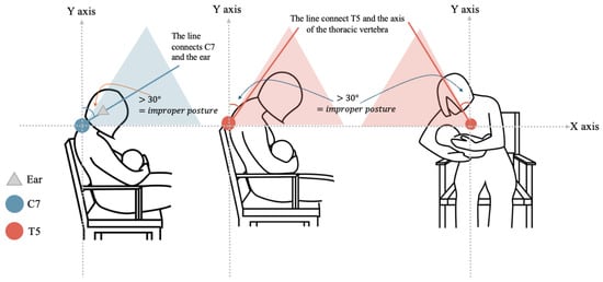Due to the complexity of the thoracic spine and the fact that each individual is different, there is a lack of research that clearly indicates how many degrees of thoracic flexion in a seated position will result in significant musculoskeletal pain. However, there is broad consensus on the adverse effects of slumped sitting. In this study, images from five papers [27,28,29,30,31] that define slumped sitting are analyzed, and an approximate angle of 30 degrees is calculated by using a vertical reference line from T5 to T1. Taking T5 as the center of the mass, a vertical reference line was drawn and extended to T1, and the angle was determined to be approximately 30 degrees after averaging the values. Figure 4 provides a visual representation of the criteria for determining “suitable” and “improper” breastfeeding postures, as well as how the specific angle ranges are calculated.