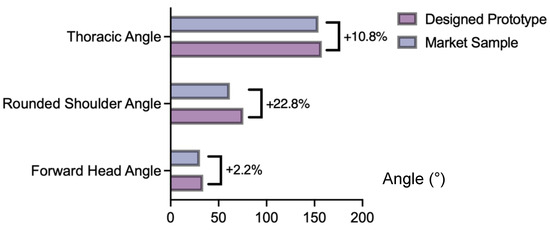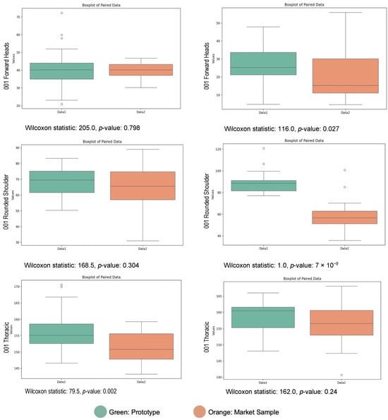 Initial data analysis showed that the postural angle data did not follow a normal distribution, so a Wilcoxon signed-rank test, a non-parametric test for paired data, was used to analyze differences between the commercial sample and prototype. In Figure 9, each boxplot illustrates the distribution of postural angles for each sample. The box shows the interquartile range, the line represents the median, and the whiskers indicate data spread, with outliers marked as points outside the whiskers. Differences in box positions and spreads reflect variations between samples. Results indicate that the thoracic spine angle for Participant 001 and the head-forward tilt and shoulder angle for Participant 002 show statistically significant differences (p < 0.05), suggesting the prototype may positively influence these angles. While other angles did not reach significance, they exhibit a trend toward higher values with the prototype, indicating a potential alignment with a healthier posture. This variation in significance may be influenced by the small sample size and individual differences among participants.