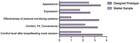 In addition to the objective measurements, subjective feedback from the questionnaire provided further data. As shown in Figure 10, the participants reported a 49.17% reduction in post-breastfeeding fatigue when wearing the prototype compared to the commercial sample. In terms of wear comfort, fit, and convenience, the prototype scores 49% higher than the commercial sample, while expressiveness and aesthetics are 50% and 40% higher, respectively. The practicality and effectiveness of the monitoring system received an approval rating of 3.375/4. The paired sample T-test results showed that these differences are statistically significant (p < 0.05), thus further validating the observed differences in the mean values. Both participants reported significant reductions in fatigue levels, even though not all posture angle data showed substantial changes. This could be attributed to the increased frequency of relaxation movements and posture shifts during the trials, which are in agreement with the findings in the study by Akkarakittichoke et al. [42].