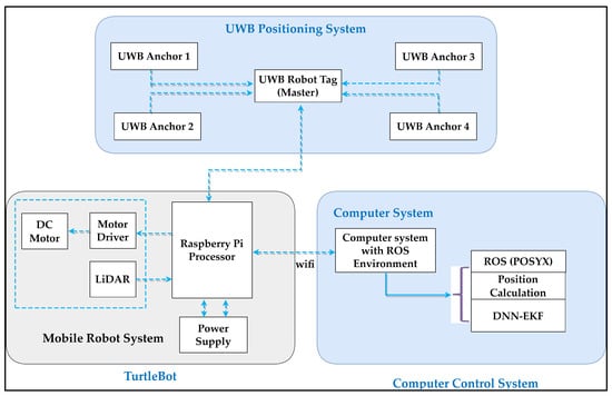 The system serves multiple functions, including interactive communication, robot control, position estimation, and robot position display [34]. Recognizing that a single sensor may not achieve high accuracy due to errors or instability, the combined usage of UWB tags and anchor sensors is implemented to enhance positioning accuracy and stability. This study proposes a robust method for position estimation and error correction, which integrates a DNN with an EKF algorithm. This approach capitalizes on the respective strengths of both techniques, thereby enhancing accuracy and reliability. The robot positioning system can acquire and integrate data from UWB tags and anchors in real time, effectively managing the noise and uncertainties inherent in the measurements. By integrating the predictive capabilities of the EKF with the adaptive learning of the DNN, the system can achieve a high level of precision and robustness in a variety of operational environments, demonstrating enhanced performance in complex and dynamic conditions.