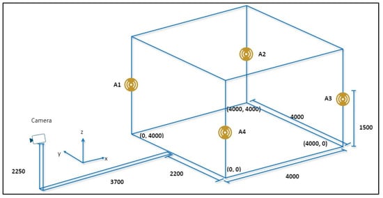 First, the observation value, , is the vector of ranges . Noise vector follows the Gaussian distribution according to Equation (2). Four anchors are located at , , , and , and can be expressed as