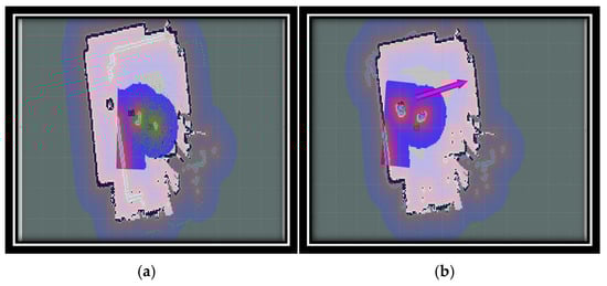 We utilized RViz, a three-dimensional visualization tool, to display a range of elements, including sensor data, robot models, and robot states. Figure 3a illustrates a map generated from sensor data collected by the robot. In this map, the white dots form shapes that are likely representative of obstacles or objects detected by the robot’s sensors. Green lines indicate specific paths or directions related to the robot’s movement or sensor orientation. Subsequent to the experiment illustrated in Figure 3b, a more comprehensive map was generated, featuring colored regions in purple, white, and green. Two green circles with red lines, which may signify orientation, represent the robot or its sensors. A purple arrow extending from one of the green circles is indicative of a planned path or direction of movement. The background grid indicates that this visualization is intended to serve as a spatial mapping or planning tool. The RViz tool facilitated effective data visualization and analysis, enabling the presentation of complex data in a manner that facilitated comprehension and interpretation.