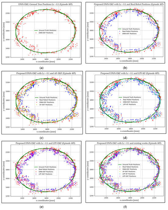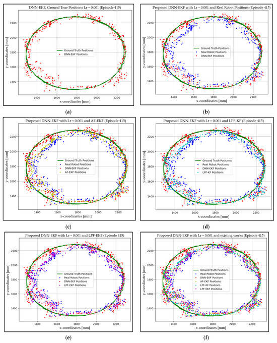 Proposed model with learning rate 0.001: model and ground truth positions (a), proposed model with real robot positions (b), proposed model and AF-EKF (c), proposed model and LPF-KF (d), proposed model and LPF-EKF (e), proposed model and all methods (f).
