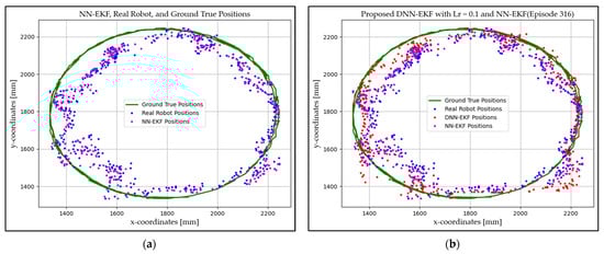 Proposed model with learning rate 0.1: NN-EKF, ground truth positions, and real robot positions (a), proposed model and NN-EKF, ground truth positions, and real robot positions (b).