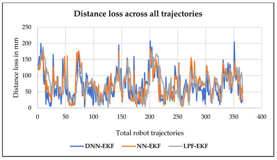 Figure 9 shows the detailed results of the proposed DNN-EKF approach in comparison with the two other algorithms of NN-EKF and LPF-EKF in terms of distance loss for visualization in a display graph. We are assessing their respective performance in predicting robot trajectories. Distance loss is a critical metric that quantifies the average discrepancy between the predicted trajectories and the actual trajectories of the robot. In simple terms, distance loss measures how far off the robot’s predicted movements are from its actual movements. It calculates the average discrepancy between the positions or trajectories that the robot is predicted to follow and the ones it follows during execution. Predicted trajectories are the robot’s intended or calculated paths based on a model or algorithm, such as neural networks, control systems, or planning software. In this context, the model predicts where the robot is supposed to go. Actual trajectories are the real-world paths that the robot follows, which may deviate from the predictions due to factors like sensor noise, imperfect actuation, or environmental changes. Lower distance loss values indicate higher accuracy and precision in the prediction of robot movement. To display this comparison graphically, we create a graph where the x-coordinate represents the trajectories of algorithms (DNN-EKF, NN-EKF, and LPF-EKF), and the y-coordinate represents the distance loss values in mm. Each algorithm has its respective bar or data point, allowing for a visual comparison of their performance.
