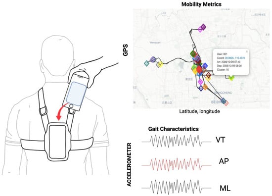 Mobility within the community was monitored using two systems: global positioning system (GPS) and using an accelerometer, both incorporated into a smartphone. The GPS provided estimates of life-space mobility metrics, while the accelerometer captured spatiotemporal parameters of gait and motor control. Smartphones, equipped with sensors such as accelerometers, gyroscopes, magnetometers, and GPS, serve as valuable, low-cost, and accessible tools for assessing mobility in older adults. The accuracy and reliability of smartphones equipped with MEMS-based inertial sensors, including the accelerometer and gyroscope found in devices such as the Samsung Galaxy A14, have been demonstrated in controlled laboratory tests. Studies have validated the performance of these sensors in various motion tracking applications, showing that they provide comparable accuracy to more advanced systems like motion capture devices []. Studies show that the accelerometer and gyroscope in modern smartphones provide valid and reliable data for estimating motion with comparable accuracy to standard systems, such as the Vicon MX motion capture system []. The studies show acceptable accuracy in measuring movement and orientation, making them viable for non-clinical applications such as gait analysis and fall prediction [,]. The GPS sampling rate was set to one data point per minute, which provided sufficient detail to track spatial movement patterns. The accelerometer, on the other hand, recorded data at a rate of 50 Hz (50 data points per second), which is adequate for capturing detailed gait dynamics. The mobile phone was securely placed on the participant’s torso, specifically between the T5 and T10 vertebral levels, using an adjustable harness to ensure stability and continuous contact with the individual’s body throughout the assessment (see Figure 1). This anatomical location was chosen due to its proximity to the center of mass of the body, providing a more representative measure of trunk balance and control during movement. Placing the phone in this area also ensures that the device does not interfere with the body’s natural movements during the assessment, providing comfort to the subject without compromising the accuracy of the data. This level of precision in device placement is critical for replicability by ensuring that the data collected accurately reflect the participant’s mobility and motor control. Each participant was monitored for approximately 8 h until they went to sleep.