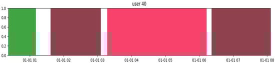 The daily mobility of each participant was visually represented by a series of colored bars, each of them corresponding to different places visited throughout the day (see Figure 2). These color-coded bars illustrate both the duration and sequence of stays at various points of interest, offering a clear overview of participants’ daily movement patterns, including time thresholds and geographic radius considerations. The beginning of each bar indicates the time of arrival at a location, while the end marks the departure, creating a chronological visualization of mobility across geographic spaces. This graph highlights not only the frequency and regularity of visits to specific places, but also the spatial and temporal distribution of each individual’s activities throughout the day. In Figure 2, the pink rectangle represents the time spent inside the participant’s house, while the other colored rectangles (brown, white, green) mean different places visited. From this visualization, we identified the spatiotemporal windows corresponding to the periods in which participants moved outside their homes. To accurately generate these stays, several key parameters were defined. First, the stop radius factor, which determines the distance within which a location is classified as a “stay”; secondly, the minimum duration necessary to define a stop, which in this study was set at 15 min; and finally, the spatial radius, which represents the distance used to group nearby points. In this analysis, we used a radius of 100 m and a minimum stop duration of 15 min to identify significant stays. These parameters were carefully selected to capture relevant movements without introducing unnecessary noise on short trips or brief stops. The choice of a 100 m radius is justified by its proven suitability for capturing daily movements, especially in densely populated urban areas. This value strikes a balance between precision and functionality in detecting points of interest within mobility patterns [,]. Similarly, the 15 min stop duration was selected to filter out brief interruptions and focus on the most meaningful activities. Previous studies have employed similar thresholds to capture significant stays that reflect important human behaviors, such as visiting a commercial establishment or resting in a park [,].
