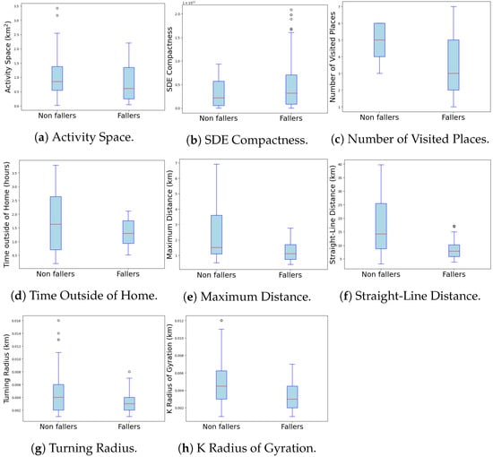 Among the variables examined, SDE Compactness, Number of Visited Places, Turning Radius, K Radius of Gyration, and Total Time Away from Home did not show significant differences between the two groups. Specifically, SDE Compactness (Figure 3b), which measures the compactness of the spatial distribution of the subject’s movement, had a p-value of p = 0.791, indicating no significant difference between fallers and non-fallers. Similarly, the Number of Visited Places (Figure 3c), which reflects the variety of locations frequented by the subject, also did not differ significantly between the groups, with a p = 0.79. The Turning Radius (Figure 3g), a parameter that describes the radius of turns made during movement, showed a p-value of p = 0.087, further suggesting no significant variation between fallers and non-fallers. Lastly, the K Radius of Gyration (Figure 3h), which represents the dispersion of the subject’s movement from a central point, yielded a p-value of p=0.032, indicating a lack of significant difference in this parameter as well. The variable Total Time Away from Home (hours) also did not show statistically significant differences between the non-faller and faller groups. The non-faller group spent a median of 1.63 h away from home (IQR = 1.94), while the faller group spent a median of 1.3 h (IQR = 0.83). A p-value of p = 0.066 suggests that this observed difference is not statistically significant (Figure 3d and Table 2).