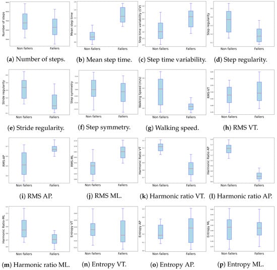 The inclusion of both life-space mobility and gait characteristics as features in this study is essential for providing a comprehensive analysis of mobility patterns in older adults and their association with fall risk. Life-space mobility metrics, such as time spent outside the home, number of places visited, radius of gyration, and maximum distance traveled, capture an individual’s spatial behavior and their interaction with the environment. These metrics are particularly important because reduced life-space mobility has been linked to increased frailty, social isolation, and a higher likelihood of falls [,]. By analyzing these variables, we can better understand how participants’ engagement with their surroundings influences their physical activity levels and overall fall risk. In addition, gait characteristics such as step count, walking speed, stride regularity, and step symmetry provide critical insights into the biomechanical aspects of mobility. Gait has been extensively studied as a predictor of falls, with irregularities in gait patterns often indicating underlying motor or balance impairments [,]. Features such as step time variability and RMS acceleration help capture not only the consistency of movement but also the stability of the gait cycle, which are crucial indicators of an individual’s functional mobility and fall risk [,]. By combining both life-space mobility and gait characteristics, this study is able to capture both the environmental and physical dimensions of mobility, offering a more holistic approach to fall risk prediction. This comprehensive set of features allows for a better understanding of the interplay between spatial behavior and motor control, thus improving the accuracy of the models used to classify fall risk in older adults.