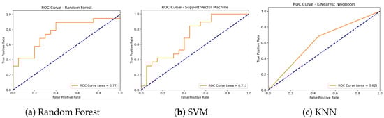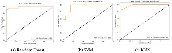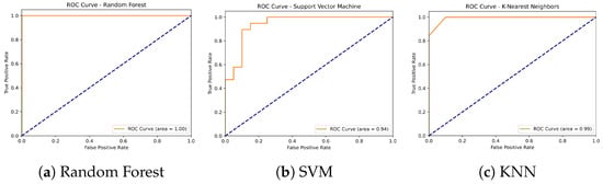 The ROC curves were generated using the test datasets following the split into training and test sets, without retraining the models on the samples used in the ROC curve analysis. This methodology ensures that the AUC calculation accurately reflects the model’s performance on the validation set.