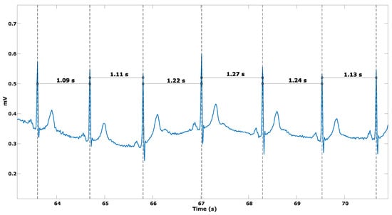 Heart rate variability (HRV) is defined as the variability of the intervals between consecutive heart beats, as seen in Figure 2 and as stated in []; this is caused by the autonomic nervous system and the interactions between the brain and the heart. Because of this, it can be used to infer something about a person’s physiological and psychological state. There are a myriad of parameters that allow for the assessment of HRV, which are split between two domains: the frequency and time domain. For time domain measurements, the basis of all parameters is the beat-to-beat interval (BBI), which is then used to calculate parameters such as the standard deviation of N-N intervals (SDNN), the root mean square of successive interval differences (RMSSDs), and the percentage of intervals that differ by more than 50 ms (pNN50). The frequency domain parameters are obtained by analyzing the spectrum of the signal, usually an electrocardiogram, within specific frequency bands. However, the frequency domain parameters are usually not calculated. This is because when using radars, the only phenomenon that is measured for the heart is the vibration it causes on the chest wall, as opposed to an ECG, where the measured signal contains information related to every single step of cardiac activity. As such, the recovered signals will not have enough information to properly calculate these parameters. With this in mind, these parameters will be disregarded in the reviewed works (whether they are measured or not).
