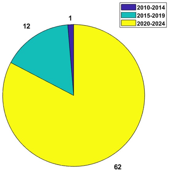 The works that were reviewed were obtained via Scopus (TITLE-ABS-KEY (“vital signs”) AND TITLE-ABS-KEY (cardiac OR “heart rate variability” OR hrv OR bbi OR “Beat to Beat Intervals” OR “Heart Rate” OR hr) AND TITLE-ABS-KEY (radar OR “Doppler radar” OR “non-contact monitoring”) AND PUBYEAR > 2017 AND PUBYEAR < 2025) and via IEEExplore (“All Metadata”: “vital signs” AND (“All Metadata”: cardiac OR “All Metadata”: “Heart Rate Variability” OR “All Metadata”: hrv OR “All Metadata”: bbi OR “All Metadata”: “beat to beat intervals” OR “All Metadata”: “heart rate” OR “All Metadata”: hr) AND (“All Metadata”: radar OR “All Metadata”: “doppler radar” OR “All Metadata”: “non-contact monitoring”)). The characteristics that were analyzed for similarities were the system architecture, carrier frequency, and measurement distance. While the first two are the most important, they are implementation-specific. The distance was also catalogued and analyzed in order to not only try and assess the impact it has on the measurements but also to assess the conditions in which the measurements are usually done, since, for a technology with such a wide range of possible uses, it is necessary to test it in an equal amount of varied scenarios. The number of subjects is also listed to provide some insight into how extensively each system is tested. With regard to the application scenarios in the reviewed works, most perform measurements in a laboratory environment with the subjects sitting upright and static during the experiments. As such, the scenarios are not specified in the tables. The results of this review are listed in Table 1 and Table 2, and the yearly distribution of the reviewed works is displayed in Figure 3 where, based on the large number of works published in recent years, it is evident that cardiac activity measurement with radar is a relevant research topic that is attracting a lot of attention.