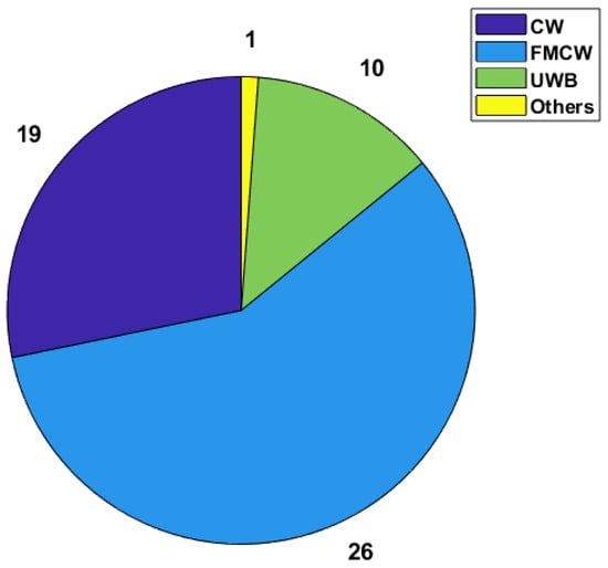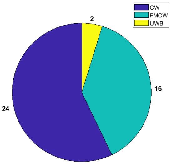 The distribution of the architectures used across the works relevant to this category can be seen in Figure 10, where it is evident that both CW and FMCW see similar amounts of usage, whereas UWB is once again the least used type of system. As such, the UWB architecture cannot be accurately compared to the other two and will not be included in any comparison of results performed from this point forward. The remaining architectures still follow a similar usage pattern to the previous category, although CW systems are more predominant in this category. Since the authors never give a reason as to why a specific architecture is chosen, it is difficult to explain this difference in usage. One possibility is that, despite the fact that FMCW radars are more robust to noise and interference than CW, they are more expensive to develop, making them less worthwhile to use in research.