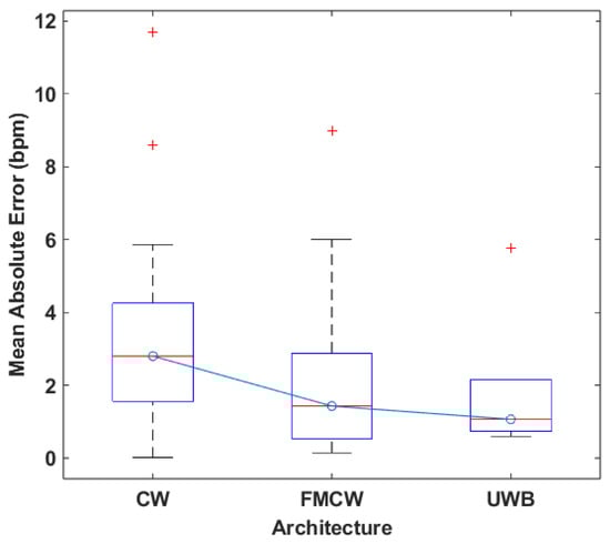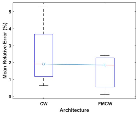 Comparing the results using what is presented in Figure 11, FMCW systems present better performance, as evidenced by the lower median error and smaller values for maximum and minimum error. This means that, on a general level, it is possible to argue that using the FMCW architecture will produce better results. This is explained by the aforementioned robustness of the architecture, which leads to a smaller dispersion of the results when compared to CW. These results follow a similar trend to the one displayed in Figure 5, which means that there is a clearly better performing architecture, which is FMCW. Lastly, since UWB is not as widely tested for these scenarios when compared to the other two architectures, it is not possible to say if (similar to the results for HR measurements) UWB would outperform the other two architectures. More tests are required to verify this possibility.
