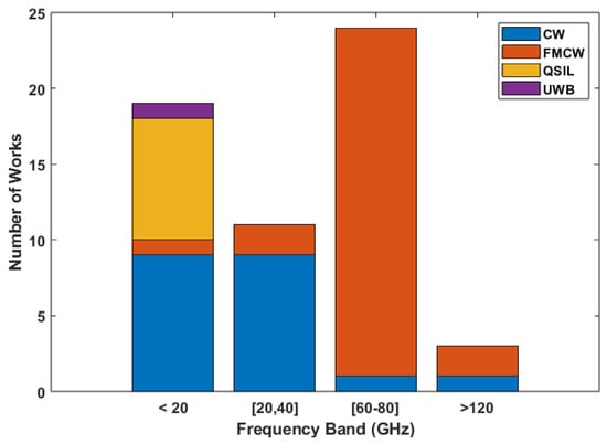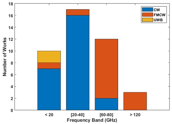 For the works in this category, only two did not specify the used carrier [,], and for the remaining works, the carriers used in each were split into the aforementioned bands based on their frequency for unmodulated systems and their corresponding center frequency for systems with frequency modulation. Their distribution across the bands is displayed in Figure 6.