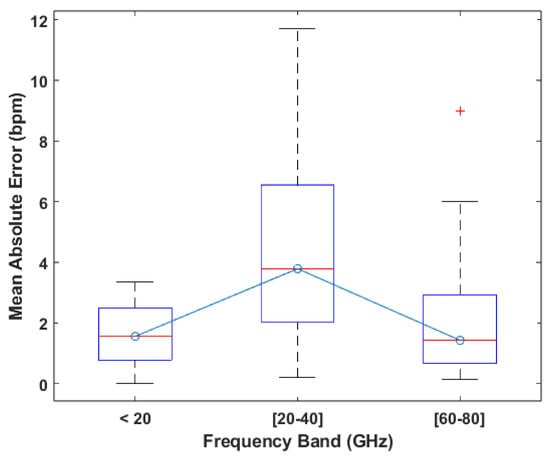 For the performance comparison of the carrier frequencies, a boxplot of the mean absolute error was made to analyze the distribution of errors across each individual bands, which is displayed in Figure 7. These results show that the second band, which is mostly composed of works using a carrier of 24 GHz, is the one that achieves the worst results, displaying not only the highest maximum error but also a higher median error, while the other two bands present very similar median values. The fourth band was not included in this analysis due to there only being two works using a system with a carrier of this band, which means it is not possible to accurately compare it to the others. As for works that performed HR measurements on different carriers, only [] performed these tests, meaning that the connection between the carrier frequency and system performance is not widely researched for these systems. Despite the fact that it is not possible to definitively say whether the performance differences between the bands is due to the carriers or the architectures predominantly used in each one, since both the first and third bands present similar results, we can confirm that there is no inherent loss of performance associated with lower carrier frequencies; therefore, there is no inherent performance gain to be achieved by increasing them.