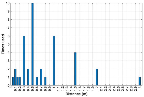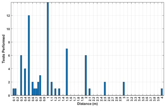 Regarding the tests conducted for the works in this category, their distribution in terms of range is displayed in Figure 14 where, much like what was displayed in Figure 8, most of the tests are conducted at distances lower than 1 m. As for systems tested across different ranges, only four of the works in this category performed measurements in different ranges [,,,], following the trend of HR-focused systems where there are few tests being performed at ranges larger than 1 m.