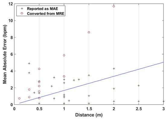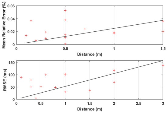 These distances lie mostly in the range below 1 m, with tests commonly being performed in increments of 0.5 m. As mentioned before, in an attempt to quantify the relation between distance and a performance metric, in this case the MAE, a linear regression was used to model the relation between distance and result error. The corresponding results are displayed in Figure 9, where there is a noticeable increase in the MAE as the distance also increases. Therefore, it is possible to link a variation in system performance based on the measurement distance, but no specific values could be determined.
