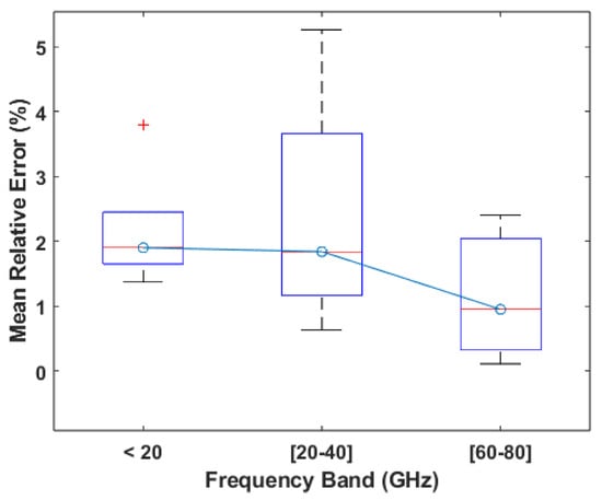 Based on the boxplot displayed in Figure 13, which was made from the mean relative errors of the works in this category, it is possible to say that the third frequency band of 60 to 80 GHz leads to better results, presenting not only the lowest median of 1% but also low values for the extremes. The 0 to 20 GHz band presents a similar distribution but exhibits a higher median value of 2%. With regard to the second band specifically, it could simply be due to the fact that all of the systems using carriers in this band use the CW architecture, which, as mentioned before, is more susceptible to interference. In fact, the boxplot for this band and the boxplot for the CW architecture shown in Figure 11 are extremely similar. The same applies to the third band and the FMCW architecture. For the first band, the performance can be explained in very much the same way as the second one, where the predominant architecture used in this band is CW; however, it is also due to the fact that these frequencies do not have enough sensitivity to achieve the same kind of results that are achievable using carriers in the third band. Lastly, considering the fact that the reasoning for choosing a specific carrier is never given, and based on the analysis performed, it is possible to say that the frequency of the carrier signal does not have an impact on the performance of the system.
