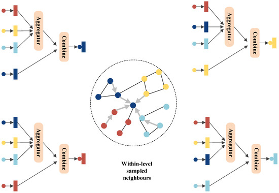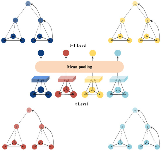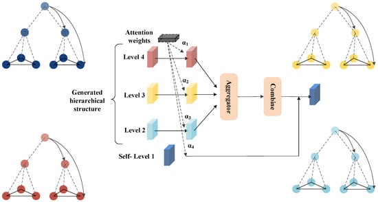 The node representations from the hypergraphs are used to update the node representations in the original graph G. The importance of information from different layers varies depending on the specific task. Therefore, an attention mechanism proposed by Veličković et al. is employed to adaptively learn the weights of the information during the top-down integration process [26]. A schematic illustration is shown in Figure 4, represented as follows: