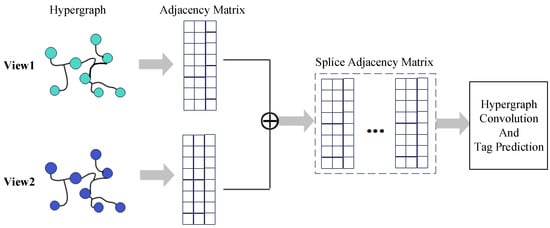 Applying the HCHG model to the node classification task on the dataset, multiple averaged results are preserved in the experiments. For HGNN convolutional layers , experiments are conducted with 2 or 3 convolutional layers and a learning rate. The correlation between different views is modeled for the multiview data by generating a hypergraph G. For each view’s data, an adjacency matrix of the hypergraph is constructed based on the HGNN proposed by Feng et al. [22]. As shown in Figure 5, the adjacency matrices of different views are concatenated to construct the adjacency matrix H of the multiview hypergraph, thus creating a hypergraph structure with multiview features. Since the macro-level graph, of the macro-level layer is relatively small, during the experiment, we averaged the input label information by pooling and added the loss function separately to calculate the edge information in the T layer. The experimental results showed no impact on the data. The possible reason is that the macro-level layer contains very little information and has minimal influence on the target nodes after top-down propagation. Therefore, the small changes in the node connection mode in have a negligible effect on the results.