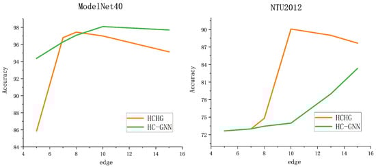 Finally, in the experiments, HC-GNN, which is constructed using GCN, was compared to HCHG to investigate the impact of the hypergraph structure on the experimental results. It was found that the effect varies for different datasets. Not all graph community structures are suitable for the hypergraph structure, and this needs to be considered in different problem scenarios. Table 5 presents the ablation experiments on the multiview data, comparing the classification results for the same nodes under various scenarios of single-view and multiview. The results from the three models in the experiment demonstrated that multiview data carries more information, which is beneficial for classification. Finally, a comparison was made on the number of neighboring nodes using the ModelNet40 and NTU2012 datasets. As shown in Figure 6, the different performances of the HC-GNN and the proposed HCHG model with varying numbers of neighboring nodes are displayed. It can be observed that the HCHG model achieves the best results even with fewer neighboring nodes, indicating that the hypergraph structure can aggregate neighbor information more quickly and accurately.