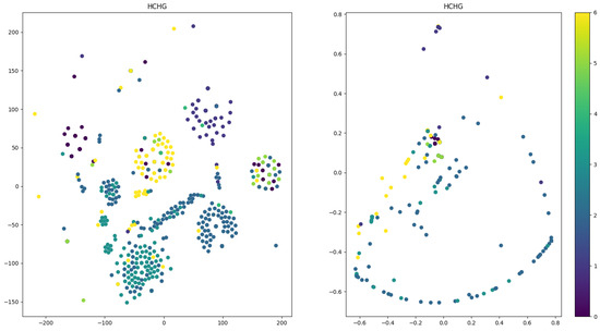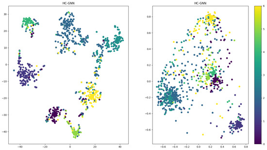 The core dataset was visualized to compare the learning abilities of graph-based and hypergraph-based methods intuitively. The t-SNE method was used to visualize the output of the last layer convolution. The results are shown in Figure 7. It can be seen from the results that compared to the graph-based method; the hypergraph-based HCHG method produces recognizable clusters, which qualitatively validates the effectiveness of the proposed method.