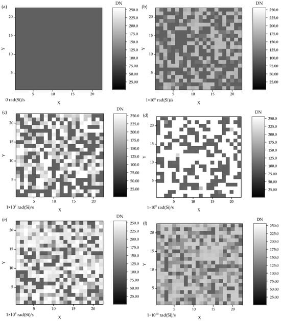 Based on the simulation results of different occurrence time and dose rate, the influence of TDRE on CISs readout circuit was studied in the aspect of imaging characteristics. As shown in Figure 9a–h, after conducting nearly to be 500 times simulations, all possible existence of pixel unit luminance value under different dose rates, such as 0, 1 × 106, 1 × 107, 1 × 108, 1 × 109, 1 × 1010, 5 × 1010, and 1 × 1011 rad(Si)/s, was respectively given out using a constructed 23 × 23 array. In the Figure 9a, the corresponding signal level was 97 DN, which was under in non-irradiated conditions.