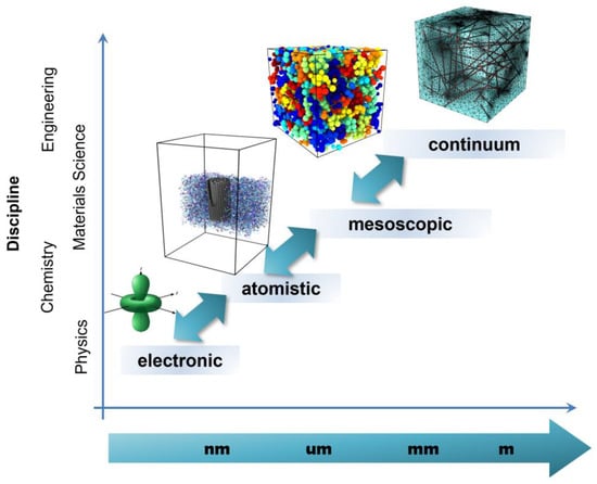 Recent advances in analytical and computational modeling enable prediction and understanding of material properties and responses on scales ranging from the electronic/atomistic, through the microstructure or transitional, and up to the continuum (Figure 1). Multiscale material modeling is based on a systematic reduction in the degrees of freedom at different length scales in which a material can be described. Connections between these scales are established either by parametrization, by grouping (i.e., coarse graining), or by homogenization procedures. These different scales in the description of materials have historically been associated with different disciplines, from physics to engineering, including chemistry and materials science (Figure 1). Each scale can be studied by means of different types of models (electronic, atomistic, mesoscopic, and continuum), which employ distinct basic entities and usually work in different ranges of timescales and number of entities (Figure 2). However, the scale and type of model do not have a one-to-one correspondence, since there are areas of overlap regarding the models that can be employed for a specific analysis.