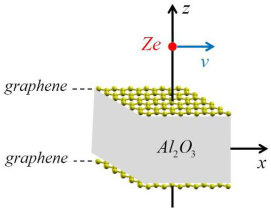 The most efficient way to probe the plasmon-phonon hybridization between graphene and the nearby insulator(s) is by means of an externally moving charged particle. Such hybridization influences the energy loss of an incident particle [20], as well as the resulting wake effect in the induced electrostatic potential [21]. The wake potential (the total potential in the plane of the upper graphene sheet) induced by an external charged particle moving parallel to the graphene-Al2O3-graphene composite system (Figure 3) was investigated in Ref. [22]. Three velocity regimes of the incident particle were considered in relation to the threshold for excitations of the Dirac plasmon in graphene, given by its Fermi velocity. It was shown that in the low-velocity regime (below the Fermi velocity), only the transverse optical (TO) phonons in the Al2O3 layer contribute to the wake potential, whereas for intermediate velocities (above the Fermi velocity), the dominant contribution to the wake potential comes from the hybridized Dirac plasmons in the two graphene layers. It was also shown that in the high-velocity regime (well above the Fermi velocity), the dominant contribution to the wake potential originates from the highest-lying hybridized Dirac plasmon. The distance of the charged particle from the top graphene, the thickness of the Al2O3 layer, and the doping density (i.e., Fermi energy) of graphene were fixed at their respective typical values. The effects of variations of all those parameters were studied in Ref. [23]. It was shown that in the low-velocity regime (below the Fermi velocity), strong effects were observed due to variation of the particle distance, while for the velocity of the charged particle above the Fermi velocity, strong effects were observed due to varying the thickness of the Al2O3 layer, as well as due to plasmon damping of graphene’s π electrons and graphene doping.