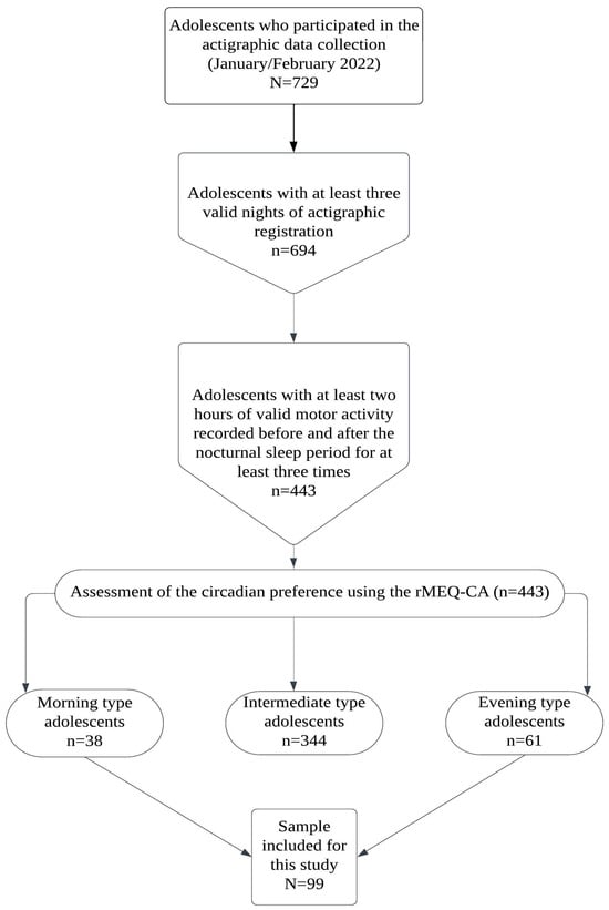 Participants for this study are drawn from the project IDENTITIES. For the current study, 729 adolescents were considered. Among them, 443 adolescents wore an actigraph for at least two hours of valid motor activity recorded before and after the nocturnal sleep period and at least three times. According to the reduced Morningness–Eveningness Questionnaire for Children and Adolescents (rMEQ-CA) cut-off scores, 61 participants (339 nights considered) belonged to the evening-type category while 38 (235 nights considered) belonged to the morning type. An overall number of 99 participants (62.6% females), with a mean age of 15.6 years (standard deviation = 1.2 years, range = 13–18 years), were hence examined in the current study (See