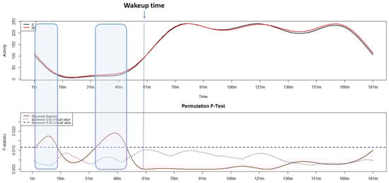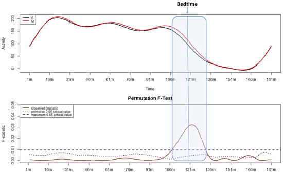 27] was utilized. In the Functional Linear Modeling (FLM) context, data processing primarily involves transforming discrete observations into functional representations and selecting an appropriate basis for expansion, such as the Fourier series. This Fourier expansion enables data representation through sinusoidal functions, capturing the main features of periodic or quasi-periodic data with a reduced number of coefficients. This approach enhances both computational efficiency and interpretability within the FLM framework. The Fourier basis transforms the data into a manageable set of coefficients, facilitating analysis in the FLM by reducing dimensionality and capturing smooth functional patterns. A 180 min time window was extracted for FLM analysis in order to examine wake inertia. Specifically, a 120 min interval was taken prior to bedtime and a 60 min interval was taken after bedtime. For sleep inertia, a 180 min time window was taken as well, with an interval of 60 min before and 120 min after get-up time. Groups of participants were then divided into different groups based on their chronotype for the statistical analyses. First, the Fourier expansion model was used to convert the raw motor activity pattern into a functional form. Second, within the previously specified time intervals, the non-parametric permutation F-test was utilized to ascertain whether and when the motor activity pattern of the wake–sleep and sleep–wake transition underwent a significant change based on circadian preference. This test employs random reassignment of data labels to generate an empirical distribution of the F-statistic, against which the observed value is compared. This approach circumvents rigid distributional assumptions, providing robust statistical conclusions even for complex data structures. The “Actigraphy” package in the R statistical program was used to carry out the FLM.