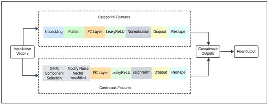 where k is determined by using . Then, to maintain numerical stability and prevent extreme outliers, the normalised value is clipped to the range . At the end, the transformed variables consist of the clipped values and the associated probabilities, providing a new representation of the continuous variables that effectively captures the multimodal attributes of the data. For each continuous variable, the metadata includes the means, standard deviations, and weights of the Gaussian components derived from the Bayesian GMM, along with the total number of modes employed. This detailed metadata provides an understanding of the underlying distribution characteristics of each variable, which is important for the generator to accurately generate and reconstruct data.