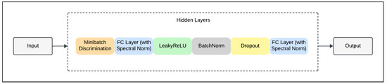 The purpose of the discriminator in the GAN framework is to assess the authenticity of generated samples. This component is crucial for the adversarial training process because it learns to differentiate between real and synthetic data, and help in guiding the generator towards producing increasingly realistic outputs. As illustrated in Figure 3, the discriminator framework consists of several layers. The architecture begins with the Minibatch Discrimination layer [27], which is essential for preventing mode collapse by ensuring that the discriminator can detect diversity within groups of samples, not just evaluate the authenticity of individual samples. It achieves this by computing distances between samples in a transformed feature space, which helps in distinguishing real data from generated counterparts that may lack variety and thus ensures the generator produces diverse outputs. Following the minibatch discrimination, each dense layer within the discriminator is wrapped with Spectral Normalisation. This approach normalises the weight matrices by their largest singular value in order to maintain stability in the training process and prevent the discriminator from overpowering the generator [28].
