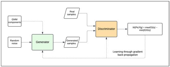 In the context of GAN, the Wasserstein loss is employed as a metric to guide the training process [31]. This approach allows the generator to create samples that more closely resemble the real data distribution. Unlike traditional GANs that use binary cross-entropy loss, Wasserstein GANs offer a more stable training process and can generate higher quality data samples. The Wasserstein loss [31], as defined in Equation (11), works by computing distance between the generated and real data distributions. In practice, this loss is calculated as the maximum difference between the expected value of the discriminator function, which is represented as , applied to both the real and generated data distributions.