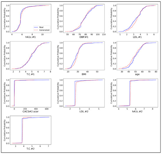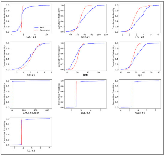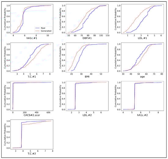 For demographic features such as BMI and age, the method (Figure 5) demonstrates superior performance. The CDF plots show that the synthetic data generated by this approach closely matches the real data distributions, while both CTGAN (Figure 6) and TVAE (Figure 7) exhibit more pronounced differences, which are reflected in higher KS statistics for these features. However, for CACS#2.scor and LDL.#2, TVAE’s synthetic data (Figure 7) aligns more closely with the real data, consistent with its lower KS statistics for these features. Although TVAE displays better KS values, visual inspection reveals slight discrepancies in the distribution shapes that the KS statistic might not fully capture. In contrast, CTGAN (Figure 6) shows the largest deviations for these features, which aligns with its higher KS values. For the final features, hA1c.#2 and T.C.#2, our method (Figure 5) demonstrates stronger performance than CTGAN (Figure 6), as shown by both the KS statistics and CDF plot alignment. Although TVAE (Figure 7) shows slightly better alignment for these features, our approach remains competitive. Overall, across most features, this method (Figure 5) outperforms both CTGAN (Figure 6) and TVAE (Figure 7) in replicating real data distributions. While TVAE performs better for certain features, particularly CACS#2.scor and LDL.#2, our method provides more consistent replication of the real data across a wider range of variables.