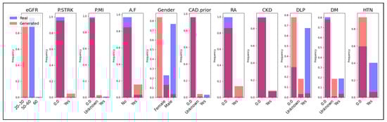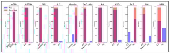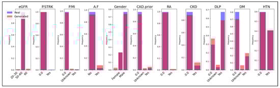 Additionally, we present a comparison of categorical features between the real and generated data in Figure 8, Figure 9 and Figure 10. Each subplot within these figures represents a different categorical feature, displaying the frequency of each category in both the real (blue bars) and generated (magenta bars) datasets. The Jaccard coefficient provides a quantitative measure of similarity between the real and synthetic categories for each feature. The results in Table 3 and the visual comparisons in Figure 8, Figure 9 and Figure 10 indicate that both CTGAN and our proposed method generally achieve higher Jaccard coefficients compared to TVAE. CTGAN attains a Jaccard coefficient of 1.00 for most features, signifying perfect overlap between the categories in the real and synthetic datasets. Our method achieves high coefficients, with values of 1.00 for eight out of eleven features and 0.67 for three features. In contrast, TVAE exhibits lower Jaccard coefficients across most features, ranging from 0.33 to 0.50, except for HTN, where it achieves 1.00. For features such as A.F, Gender, RA, CKD, DLP, DM, and HTN, both CTGAN and our method achieve a perfect Jaccard coefficient of 1.00, as depicted in Figure 8 and Figure 9. This demonstrates excellent preservation of categorical distributions and indicates that both models effectively capture the categories present in the real data for these critical medical features.