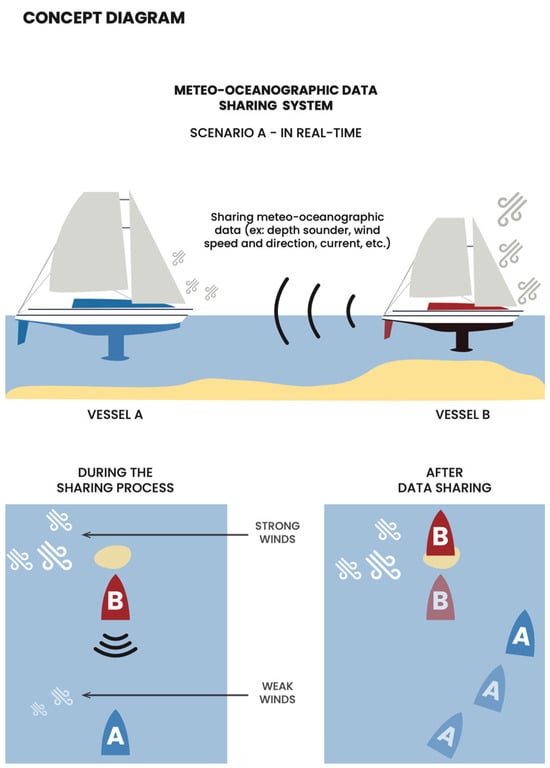 Despite both offshore and coastal waters presenting challenges to navigation, such as limited infrastructure for immediate aid [], or intense currents and unexpected winds, inland waters pose even more demanding navigation conditions due to shallower depths, narrower channels, intertidal channels, and non-linear tidal propagation [], demanding precise and anticipatory data on a vessel’s position and the real water depth [,] to avoid grounding. Due to these conditions, it is particularly challenging for ships and vessels with drafts higher than the available water height (observed depth) [] to navigate through shallow navigation channels, such as bars, rivers, and harbors [,]. Shallow channels pose a risk of grounding, which can lead to significant delays and potential damage to vessels. To mitigate the aforementioned risk, Figure 1 illustrates a conceptual approach to the data sharing system. This system allows Boat B to share real-time data with Boat A. These data may encompass information regarding the presence of shallow areas, strong winds, or other potential hazards that Boat B has previously encountered. By receiving this information, Boat A is thereby enabled to anticipate and adjust its maneuvers in advance, thus avoiding these dangers and ensuring a safer and more efficient passage.