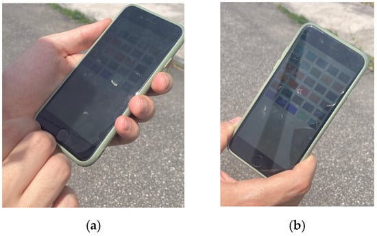 The maritime sailing environment (e.g., direct sunlight) can lead to Situational Visual Impairment (SVI), so it is essential to validate interfaces and functional requirements with the mariners who will be using them. Gathering feedback from those involved in maritime activities ensures that systems are aligned with user needs. Addressing SVI is critical in maritime operations where environmental factors affect visual perception and information processing [,]. Therefore, a set of colors were observed and assessed under direct sunlight (Figure 2 and Figure 3). To evaluate the system’s final performance, an iPhone SE 2020 [] with 625 nits was used.