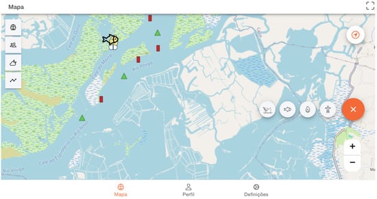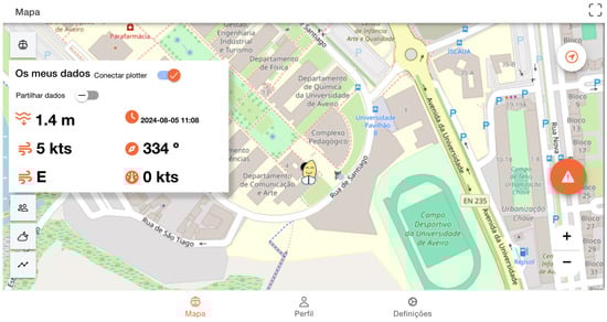 The interface was developed to be able to synthesize data received from the user’s NMEA network (Figure 4). The user can choose whether to share these data with others (Figure 4–in Portuguese, “Partilhar dados”). The technical process of data sharing between vessels and how sensors contribute to this process can be better understood in the following section.