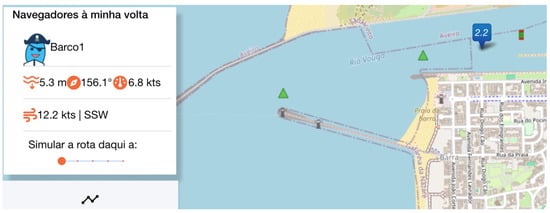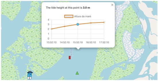 The feature “Sailors Around You” (in Portuguese “Navegadores à minha volta”) enables the users to monitor nearby boats identified by their avatar, boat name, and shared meteorological and oceanographic data, such as water depth and wind (Figure 6). Additionally, users can receive real-time tidal height information about any selected area by clicking on any given point in the main map (Figure 7).