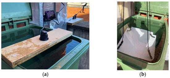The depth sounder presented a significant challenge in the simulation station, since accurate readings required a minimum depth of approximately 1 m and, preferably, it should be inside water. To tackle this issue, a trash bin was used to fill it with water and the sounder was placed on a wooden platform (Figure 8a). A K-line with adjustable weights was used to raise and lower the false bottom to simulate variable bottom conditions (Figure 8b), such as those encountered when navigating inland waterways.