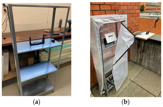 To ensure that the GPS signal was received properly, the plotter had to be placed on a storage shelf (Figure 9a), while the anemometer was mounted on a robust wooden platform to ensure stability in case of strong winds. This setup was installed on an outdoor balcony at the university department to simulate real-world conditions and obtain a preliminary simulation of a real usage scenario (Figure 9b).